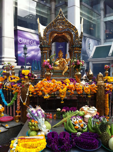 After shopping and eating, we walked to Erawan Shrine where there were tons of people praising Buddha. Everyone purchases these beautiful flowers and they burn incense and dance around the buddha. It was quite a site to see.